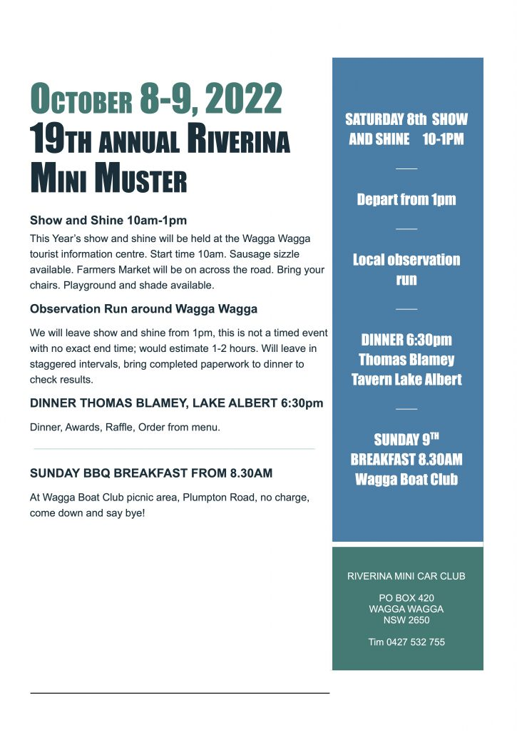 For more information about the event and accommodation or to confirm you will be attending please contact Joe Zulian 0439 485 352 or email: social@miniclub.com.au