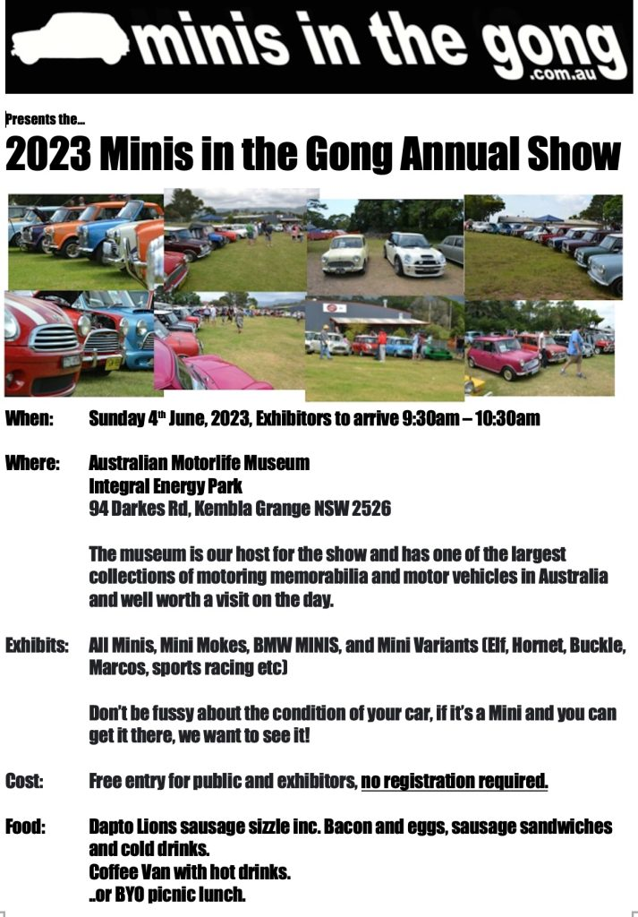 The Mini Car Club of NSW will have a display of a maximum of 10 Minis as part of this event. (Event no. 4,721 with Motorsport Australia)